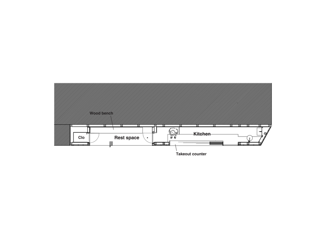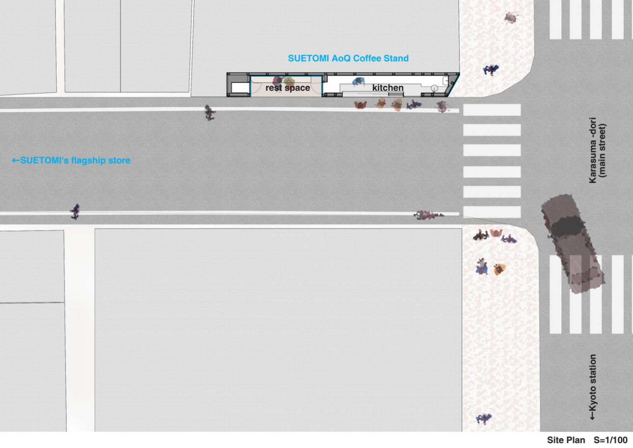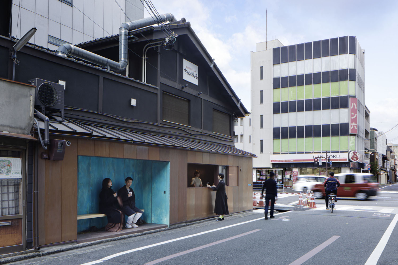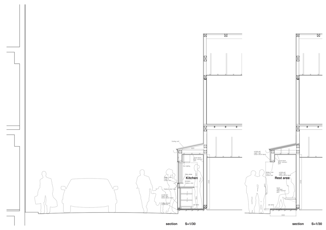当咖啡馆关门时,休息区覆盖着卷帘,该卷帘由最初用于建筑施工临时脚手架的网片制成。当它在晚上点亮时,它就像历史上日本贵族家庭使用的竹帘,可以看到墙壁上的铜绿颜色。它既充当行人的“路灯”,又充当商店的广告牌。