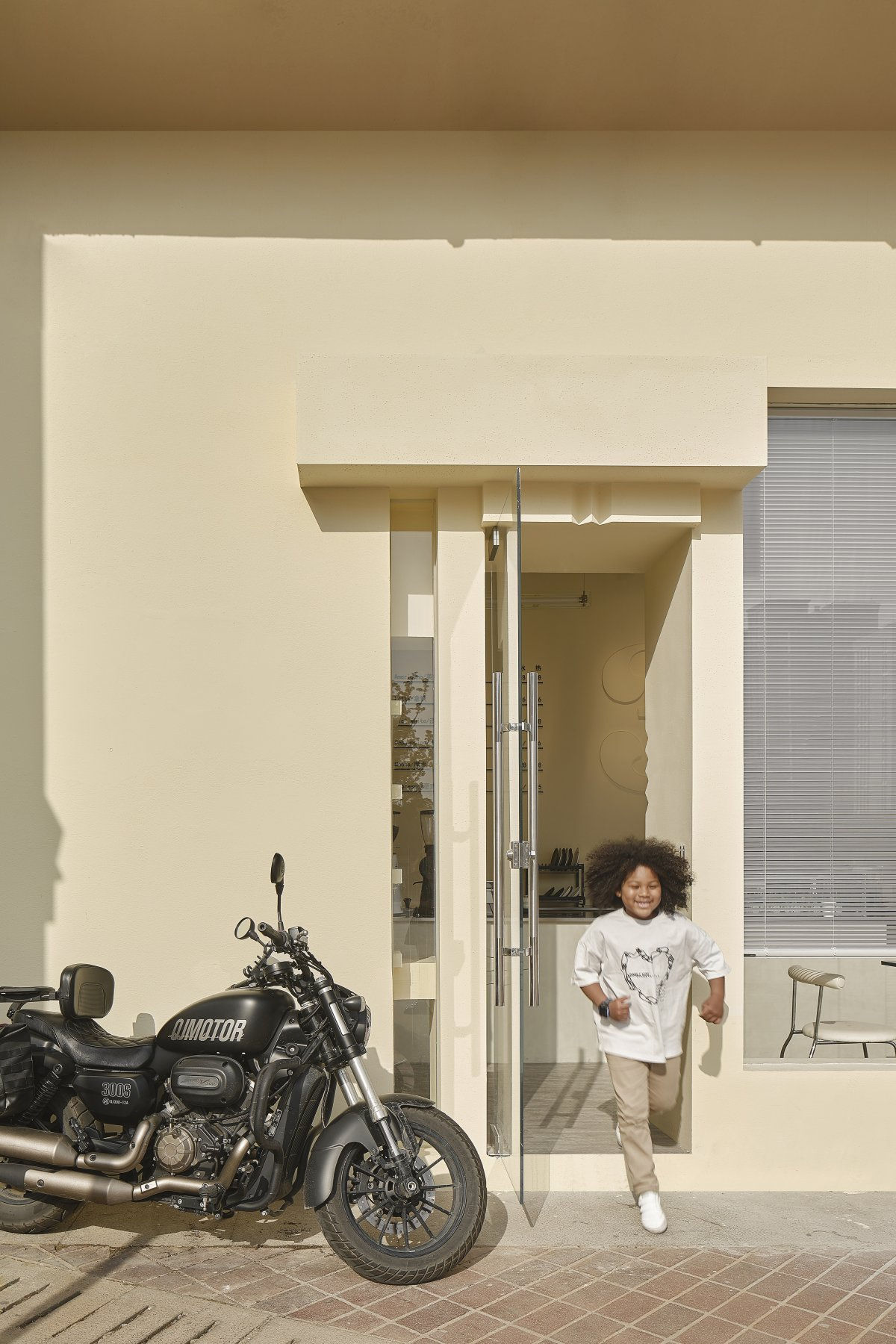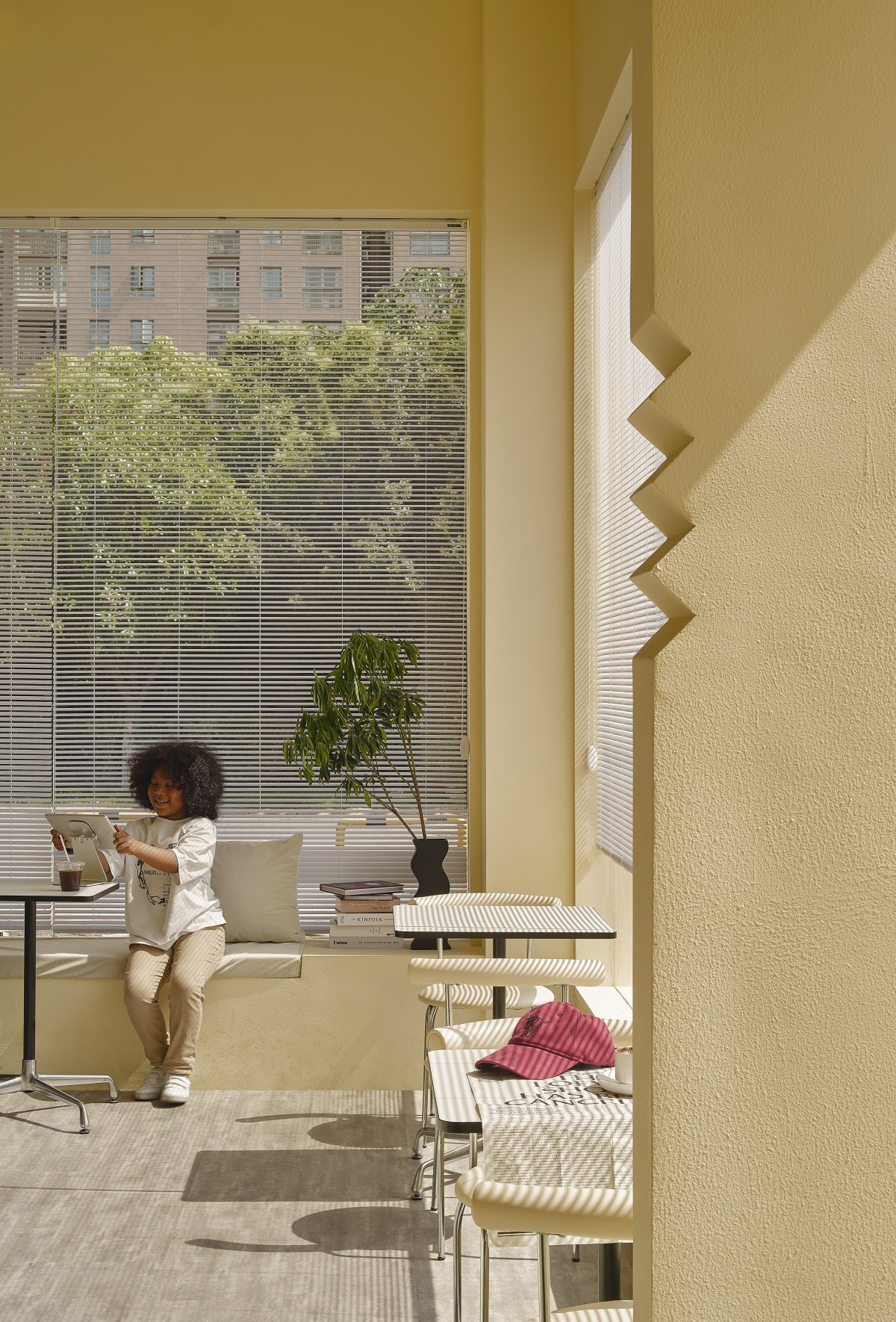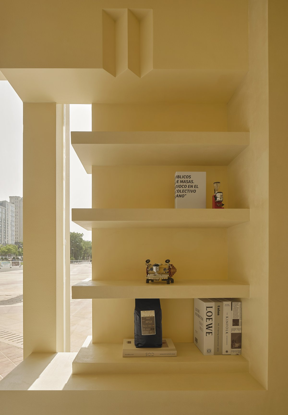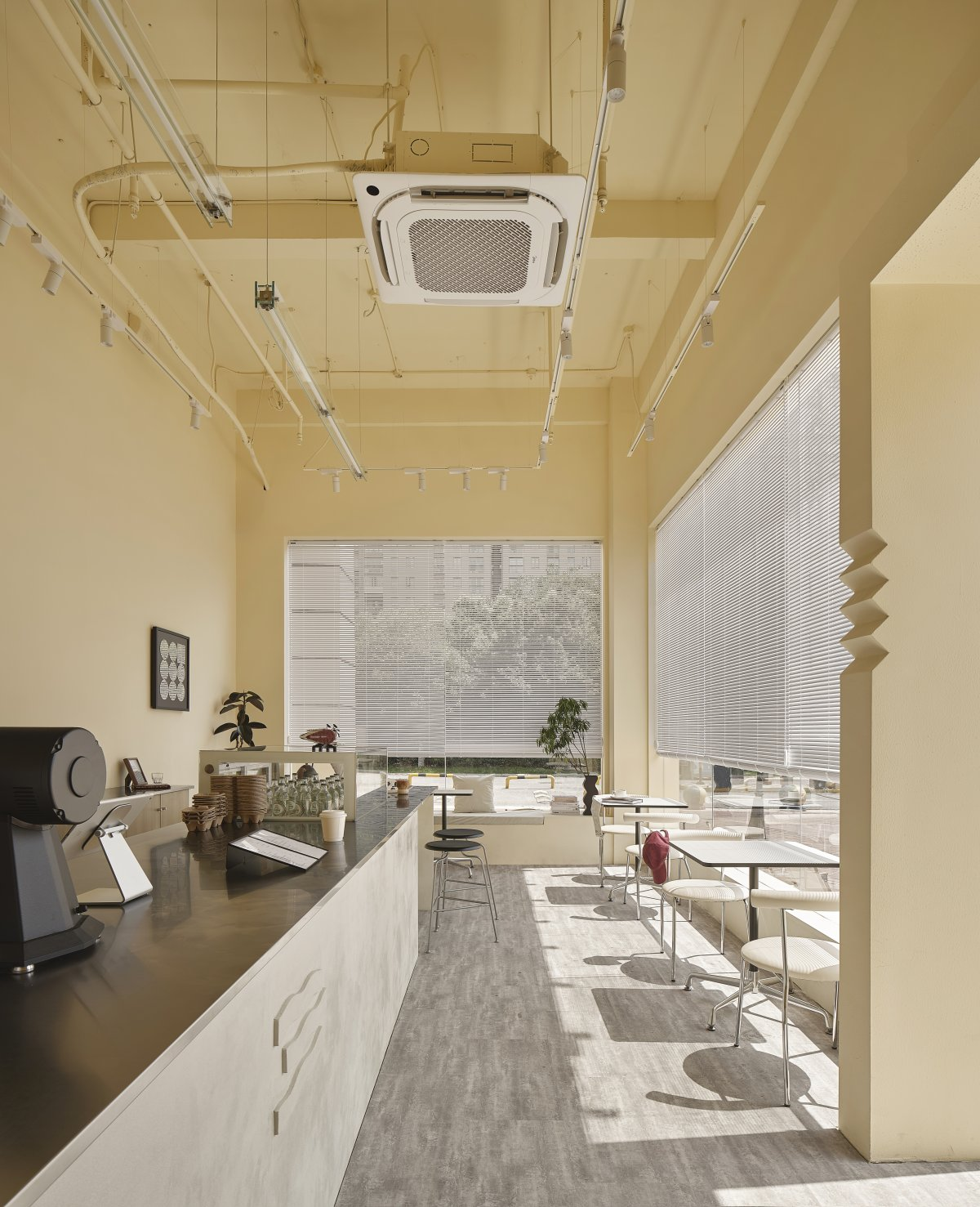 The interior space is a mixture of eclectic textured microcement and the same color latex paint. The main reason for choosing this tone form is that we are in a corner of the building, so that it merges the colors of the facade and then blends into the building, and the expanded window display surface harmonizes the distance between the interior and exterior of the building. It’s like slipping into the community.