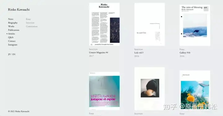 网站排版简洁舒服,项目索引很全。作品的预览非常多,可以清晰的看到创作脉络,还有视频作品可以观看。同时,大家能系统的看到她从01年到19年出版的画册,有简单的作品介绍。相比网络上零散的“小清新”,她的个人网站能让你重新认识川内伦子。
