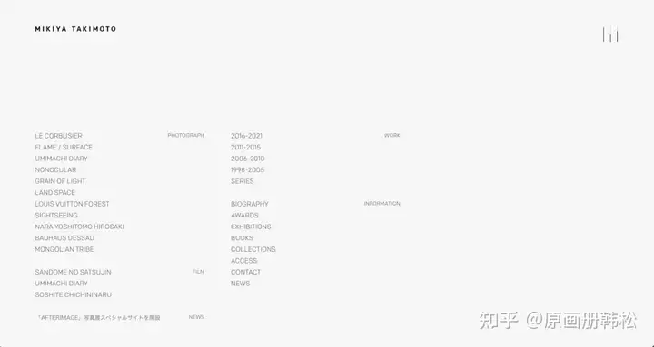 推荐水谷吉法网站的原因在于——全。网站里除了出版画册的介绍,水谷吉法拍摄的项目也非常齐全,并且每个项目都能看到较为完整的呈现。