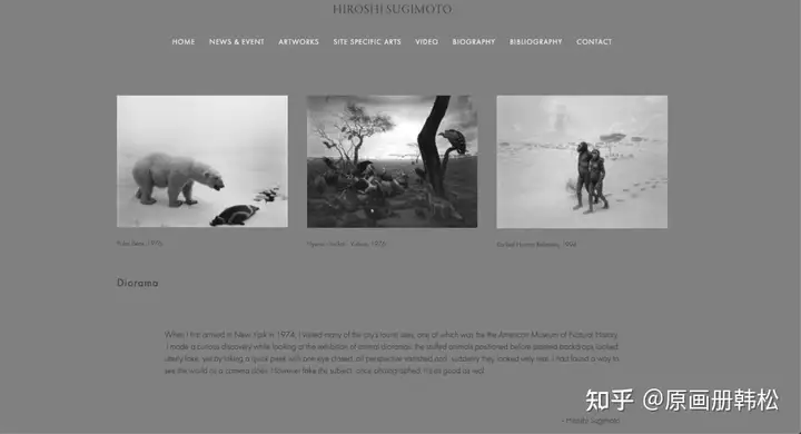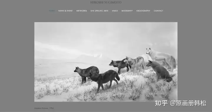 杉本博司的个人网站比较综合,呈现了艺术家的不同方面。项目预览每组只有三张照片,配有简单的自述文字,如果只想看摄影作品的话可能会觉得不过瘾。不过除摄影作品外,其他内容比较丰富。有他个人参与创作的建筑,还有短视频与访谈可以观看。