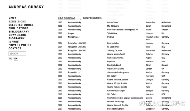 Andreas Gursky的网站简洁干练,内容从最新信息、作品、展览到出版物都有囊括。作品分为了个人项目与团队项目,从1987年至今都有展示。还有一些杂志访谈以及他个人参加的展览海报可以下载,算是小小的彩蛋。