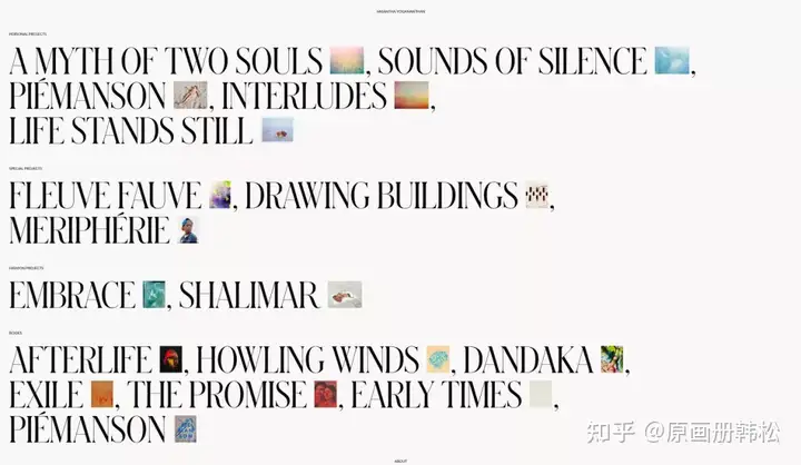 Vasantha的网站设计得很特别,巨大的项目名称占据首页,每个项目配上一张照片,让人能粗略感受项目风格。他的分类做得也很好,个人项目、特殊项目、时尚项目都清晰的呈现了出来,能让观看者快速找到自己感兴趣的部分。