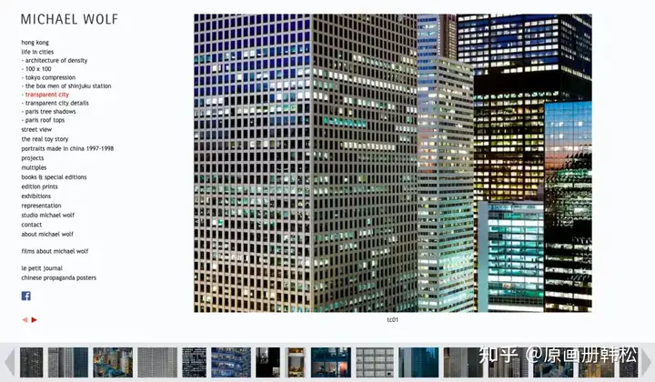 Micheal Wolf网站首页很有他「街景截图」系列作品的味道,无数小图片如同监视器不停切换。虽然设计简洁,但是内容丰富,几乎所有项目都能在网站里找到。左侧索引详尽且细致,能看到不同项目的脉络。
