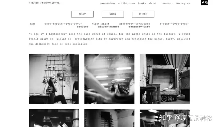 如同Libuse的作品一般,网站的视觉冲击也很强。项目根据内容、时间、地点进行分类,观众能通过不同路径了解摄影师的创作历程。交互感的设计也有许多小巧思,未被选中的项目名称会被横线划掉,如同被涂改过的秘密日记。