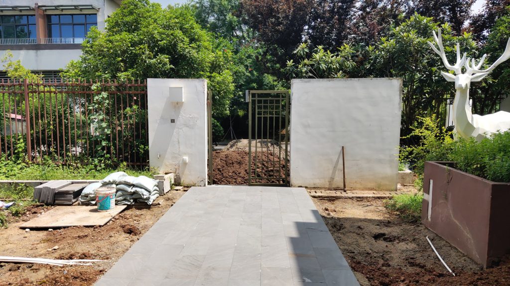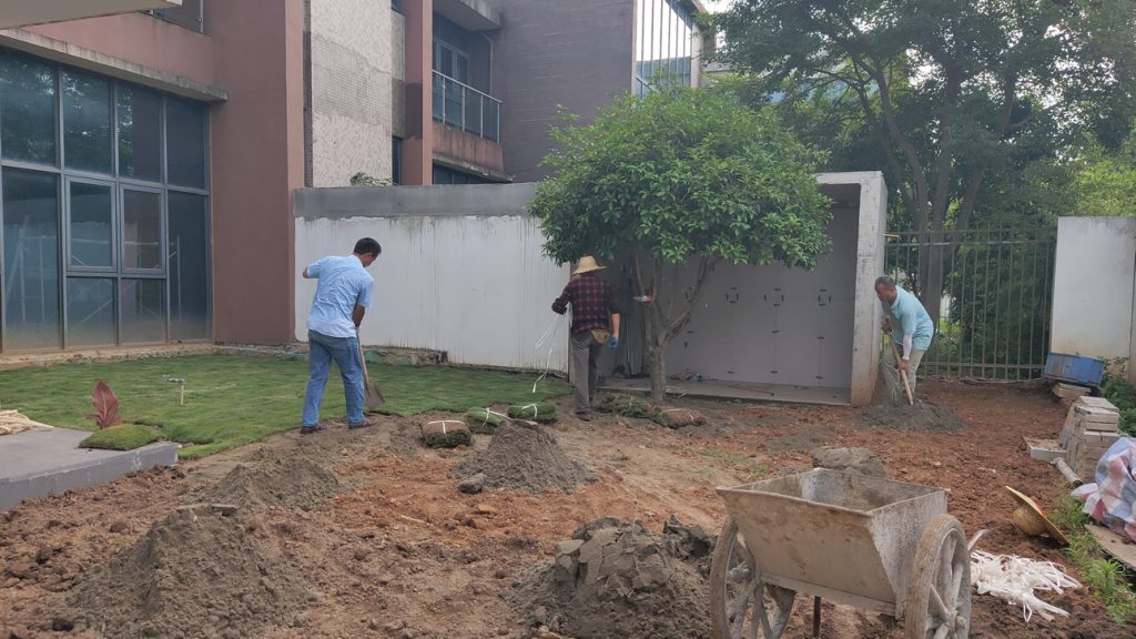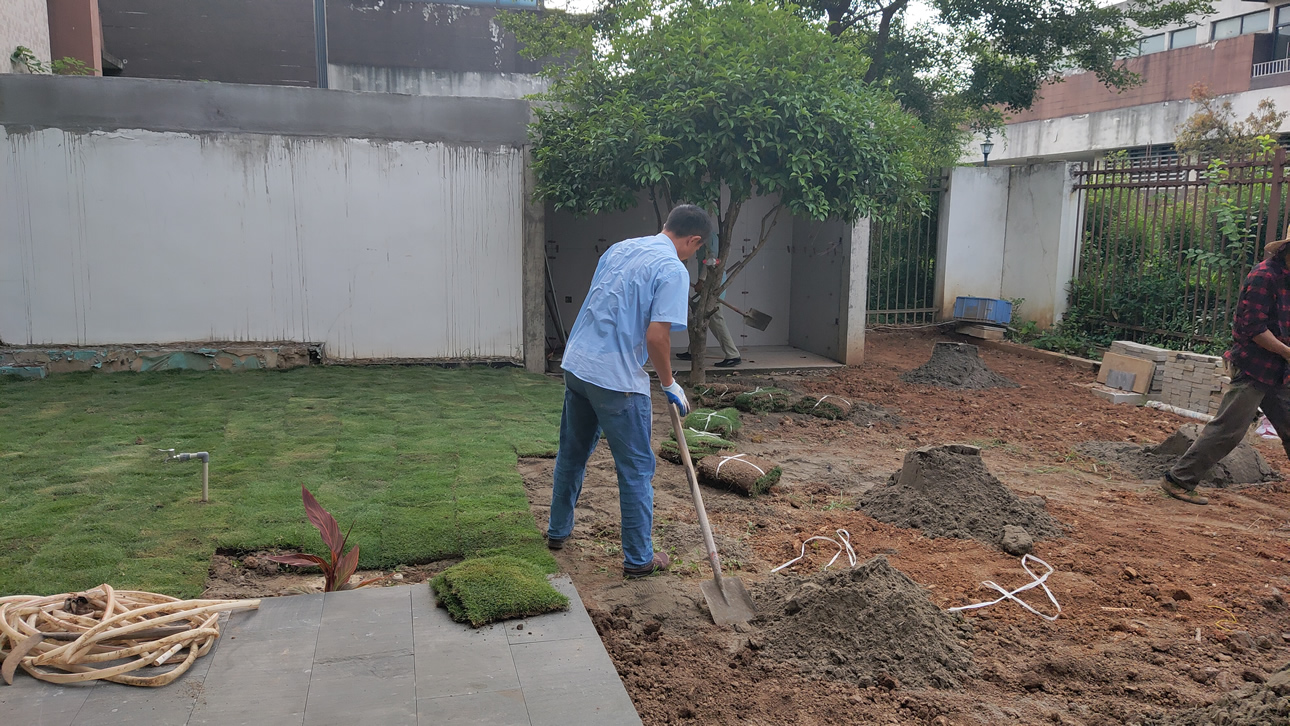 前两天把地整出来了,今天开始铺草皮了,因为要买土和泥沙,就还是请了工人来铺